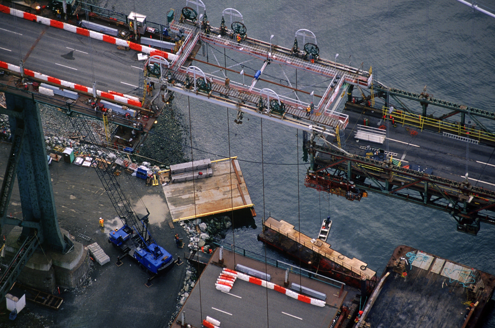 Reconstruction of the Lions Gate Bridge in Vancouver, Canada. The bridge was kept open during the project with nightly closures to replace sections.
